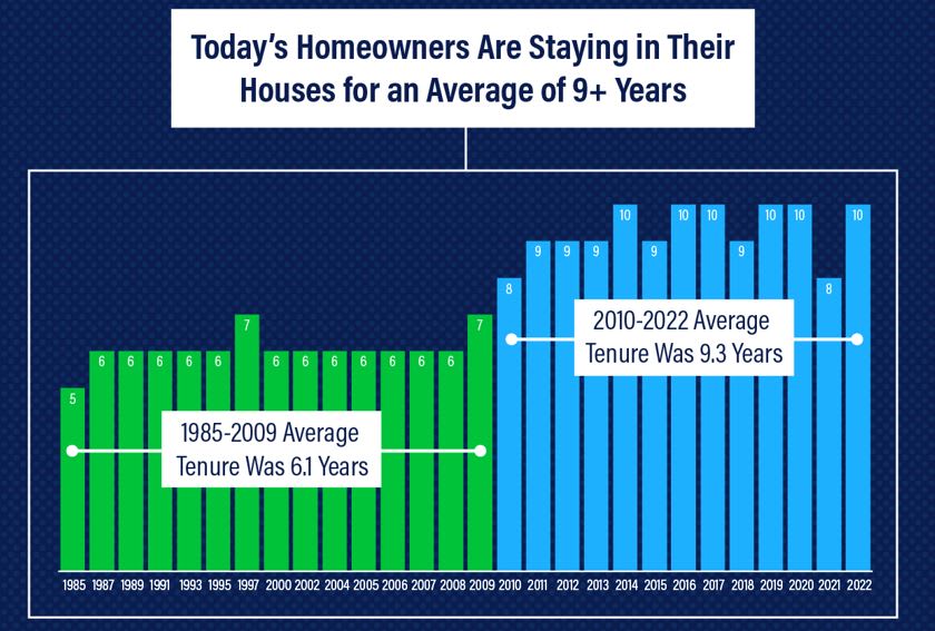 Since 2010, people have been living in their houses for longer. This leads to fewer houses for sale since people don't move as often.